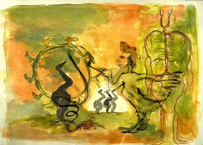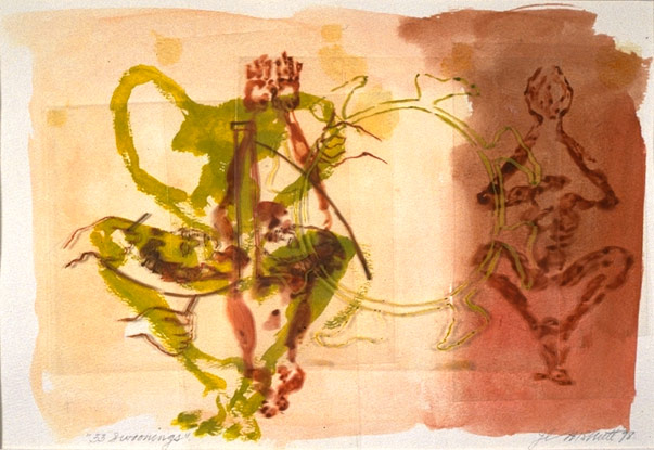 Many of these drawings were made during the time I was working on the performance “33 Swoonings” where a layering of images expressed, simultaneously, the eternal longing for the sacred and a disarming of language. The tension between our animal selves and our symbol making selves propels a perpetual shape-shifting and boundaries in flux.