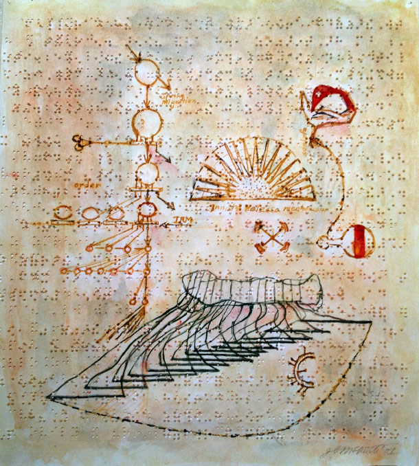 The Braille Cosmograms are a small selection of works used in video projection for “33 Swoonings”. Some of my writings were translated into Braille which then provides a rich surface for the drawings. These schemata, alluding to our irrepressible impulse for symbol making, reference motor and synaptic charting, neurological and other ephemera of bodies, local and celestial.